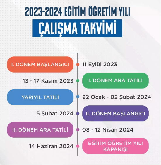 İkinci dönem, 5 Şubat 2024 Pazartesi başlayacak ve 14 Haziran 2024 Cuma sona erecek. İkinci dönem ara tatili ise 8 Nisan 2024 Pazartesi ile 12 Nisan 2024 Cuma tarihleri arasında yapılacak.